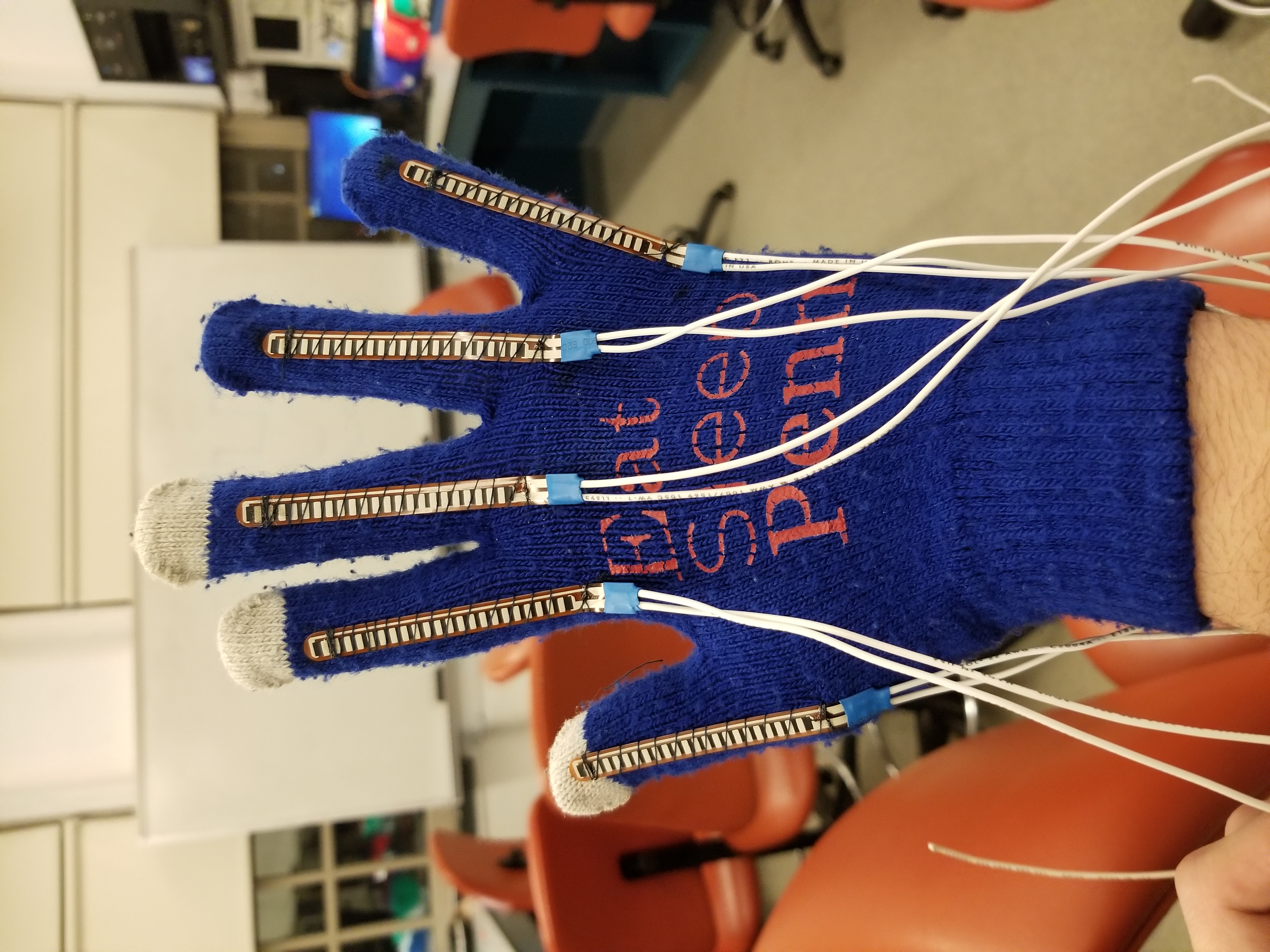 We started constructing the glove which will have the flex sensors (SparkFun SEN-10264) that will give us the position of the able hand’s fingers in order to translate them to a prosthetic. So far we have sewed the flex sensors into a glove.