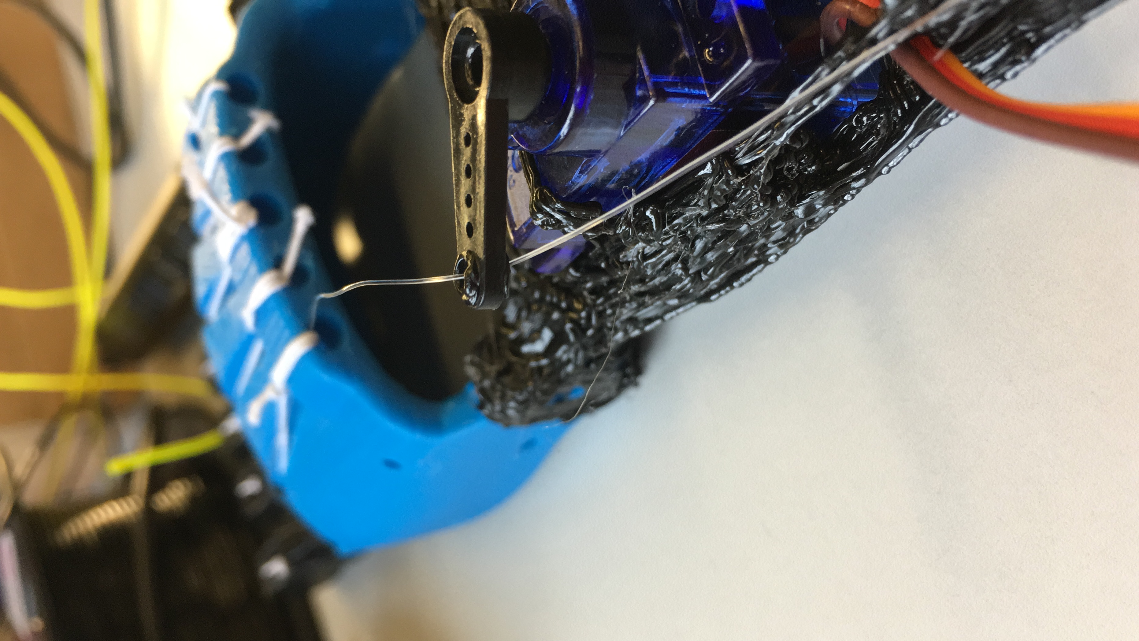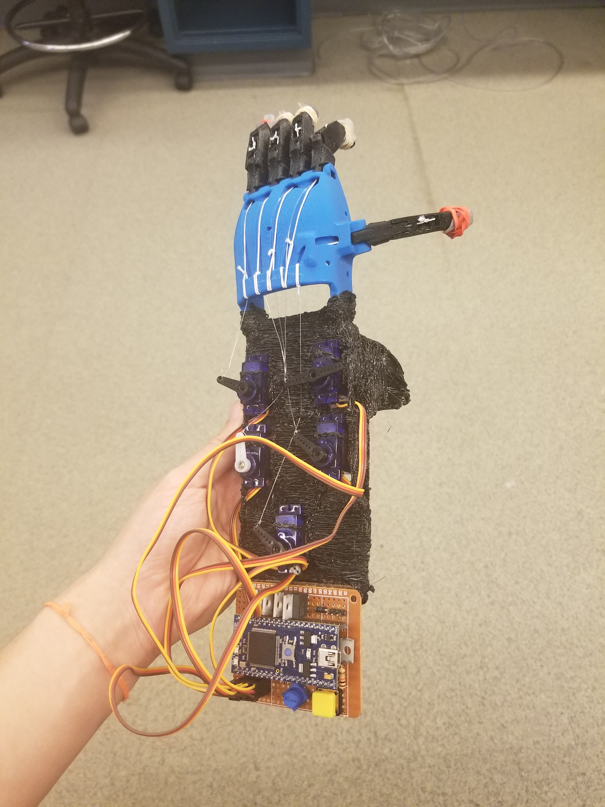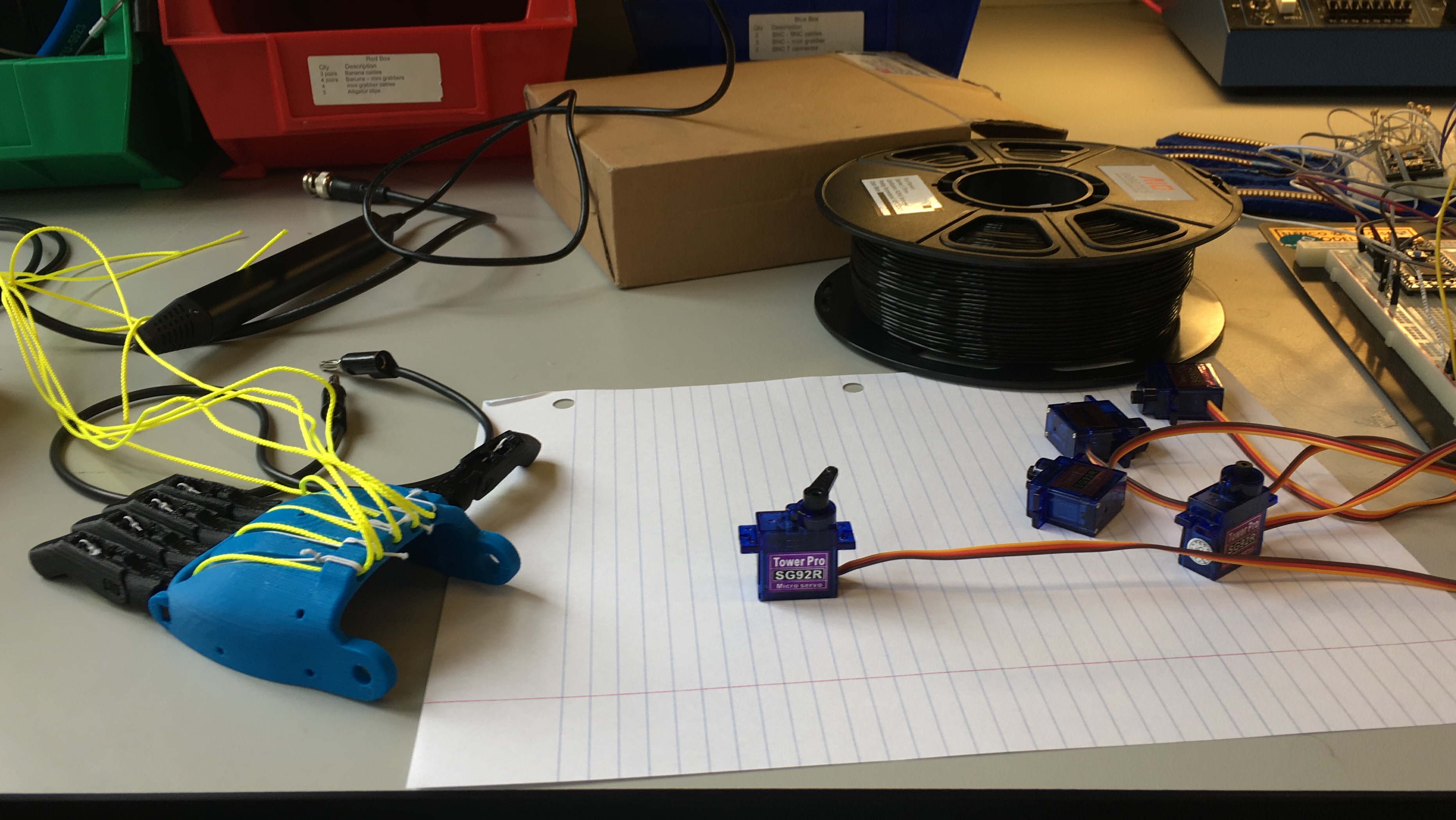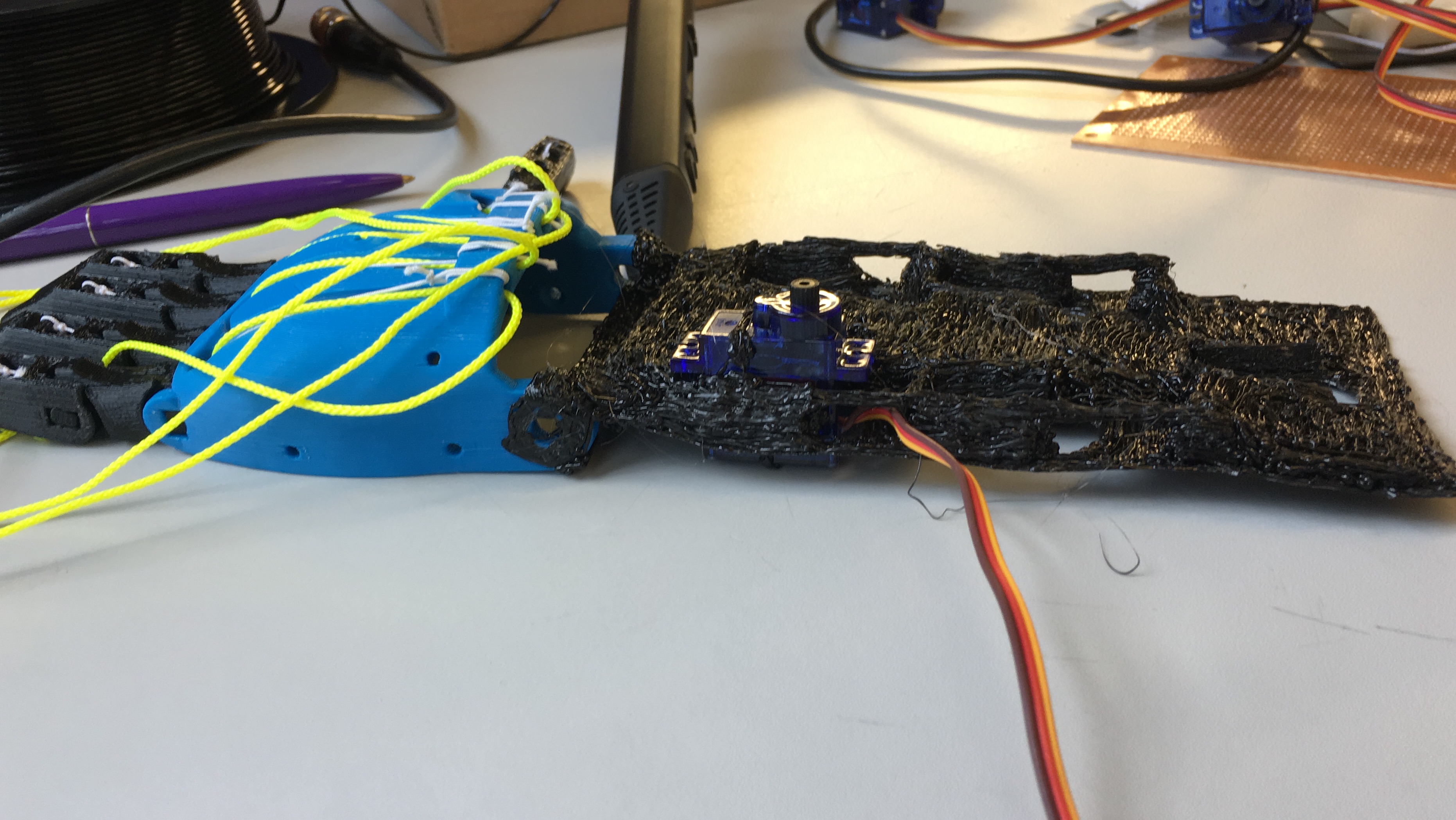 Once one of the fingers was tied up we attached it to a servo and had it flex and unflex the finger.